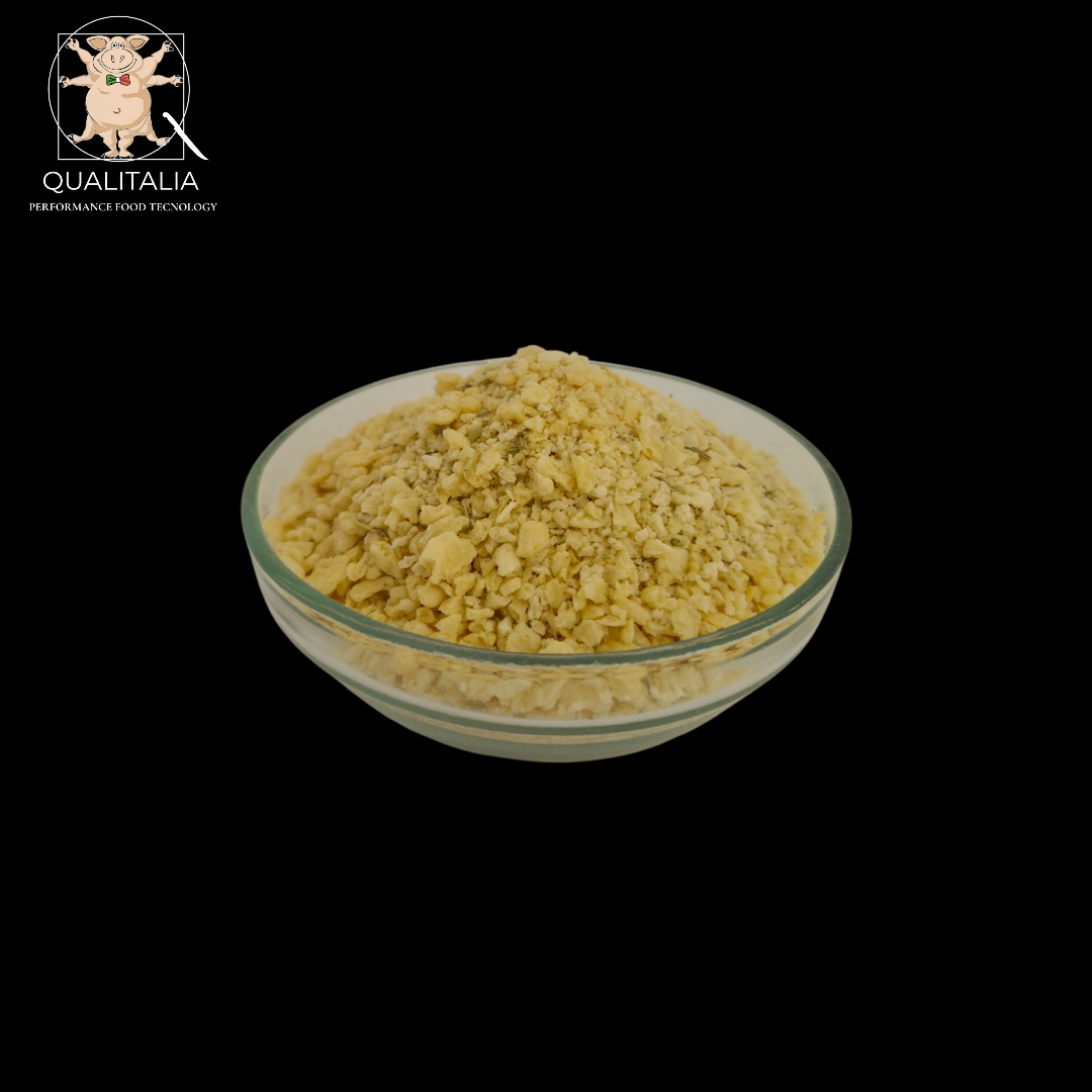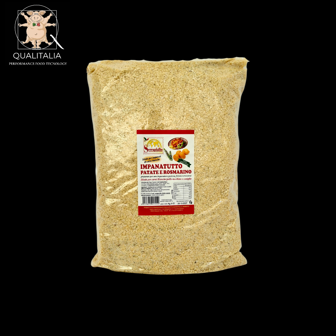 Panatura croccante a grana grossa essiccata ad alta temperatura, dove la dolcezza della patata incontra l’aroma pungente del rosmarino.